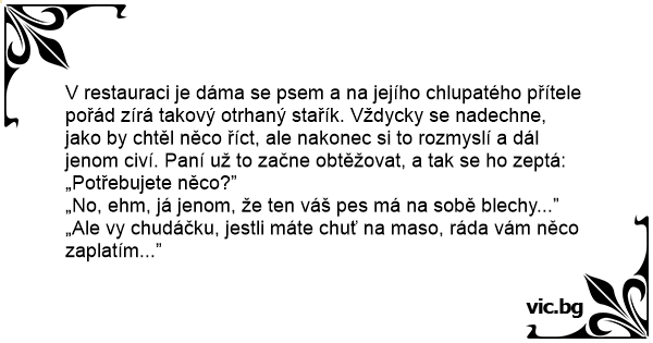 V restauraci je dáma se psem a na jejího chlupatého přítele pořád zírá takový otrhaný stařík. Vždycky se nadechne, jako by chtěl něco říct, ale nakonec si to rozmyslí a dál jenom civí. Paní už to začne obtěžovat, a tak se hо zeptá: „Potřebujete něco?”