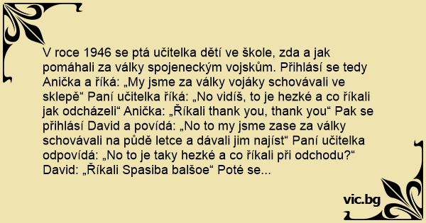 V roce 1946 se ptá učitelka dětí ve škole, zda a jak pomáhali za války spojeneckým vojskům. Přihlásí se tedy Anička a říká: „My jsme za války vojáky schovávali ve sklepě“ Paní učitelka říká: „No vidíš, to je hezké a co říkali jak odcházeli“ Anička: „Říkali thank you, thank you“ Pak se přihlásí David a povídá: „No to my jsme zase za války schovávali na půdě letce a dávali jim najíst“ Paní učitelka odpovídá: „No to je taky hezké a co říkali při odchodu?“ David: „Říkali Spasiba balšoe“ Poté se přihlásí Pepíček a povídá: „No to já za války dokonce vojákům odjišťoval granáty, když bojovali a likvidivali nepřátelské tanky“ Paní učitelka je nadšená: „No Pepíčku, to je ale úžasné, ty jsi statečný, co ti říkali?“ Pepíček: „Sehr gut der Junge, sehr gut..“