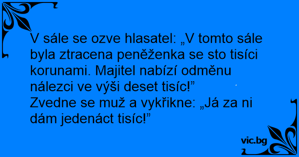 V sále se ozve hlasatel: „V tomto sále byla ztracena peněženka se sto tisíci korunami. Majitel nabízí odměnu nálezci ve výši deset tisíc!”