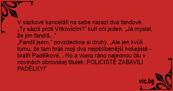 „Fandil jsem,” povzdechne si druhý. „Ale jen kvůli tomu, že tam hráli moji dva nejoblíbenější hokejisté - bratři Padělkové... No a včera ráno najednou čtu v novinách obrovskej titulek: POLICISTÉ ZABAVILI PADĚLKY!”
