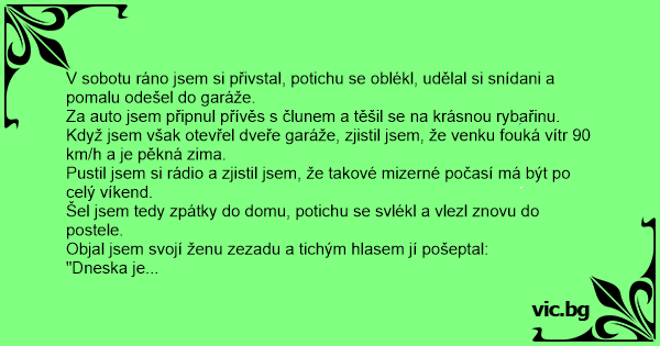 "No a to si představ miláčku, že ten můj blbec v tom počasí odjel na ryby".