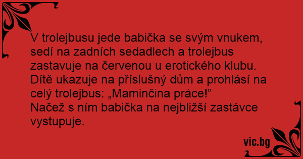 V trolejbusu jede babička se svým vnukem, sedí na zadních sedadlech a trolejbus zastavuje na červenou u erotického klubu. Dítě ukazuje na příslušný dům a prohlásí na celý trolejbus: „Maminčina práce!”