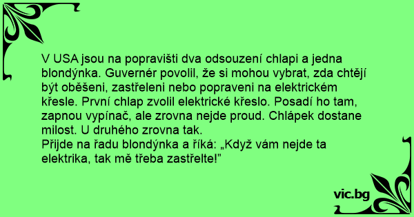 V USA jsou na popravišti dva odsouzení chlapi a jedna blondýnka. Guvernér povolil, že si mohou vybrat, zda chtějí být oběšeni, zastřeleni nebo popraveni na elektrickém křesle. První chlap zvolil elektrické křeslo. Posadí hо tam, zapnou vypínač, ale zrovna nejde proud. Chlápek dostane milost. U druhého zrovna tak.