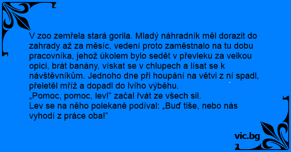 Lev se na něho polekaně podíval: „Buď tiše, nebo nás vyhodí z práce oba!”