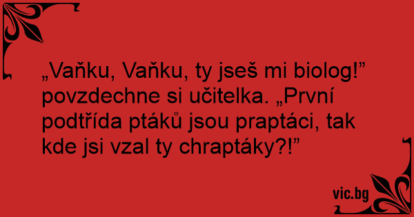 „Vaňku, Vaňku, ty jseš mi biolog!” povzdechne si učitelka. „První podtřída ptáků jsou praptáci, tak kde jsi vzal ty chraptáky?!”