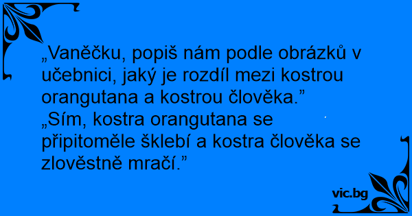 „Vaněčku, popiš nám podle obrázků v učebnici, jaký je rozdíl mezi kostrou orangutana a kostrou člověka.”
