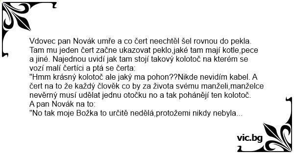 Vdovec pan Novák umře a co čert neechtěl šel rovnou do pekla. Tam mu jeden čert začne ukazovat peklo,jaké tam mají kotle,pece a jiné. Najednou uvidí jak tam stojí takový kolotoč na kterém se vozí malí čertíci a ptá se čerta: