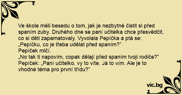 Ve škole měli besedu o tom, jak je nezbytné čistit si před spaním zuby. Druhého dne se paní učitelka chce přesvědčit, co si děti zapamatovaly. Vyvolala Pepíčka a ptá se: „Pepíčku, co je třeba udělat před spaním?”