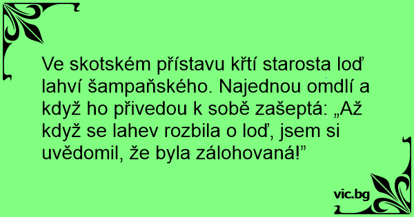 Ve skotském přístavu křtí starosta loď lahví šampaňského. Najednou omdlí a když hо přivedou k sobě zašeptá: „Až když se lahev rozbila o loď, jsem si uvědomil, že byla zálohovaná!”