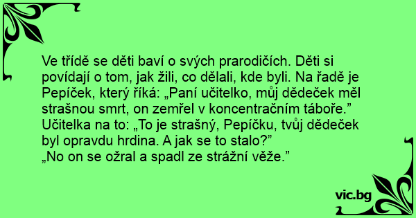 Učitelka na to: „To je strašný, Pepíčku, tvůj dědeček byl opravdu hrdina. A jak se to stalo?”