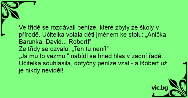 Ve třídě se rozdávali peníze, které zbyly ze školy v přírodě. Učitelka volala děti jménem ke stolu: „Anička, Barunka, David... Robert!”
