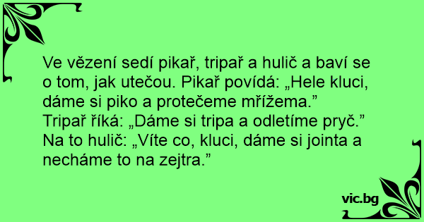 Ve vězení sedí pikař, tripař a hulič a baví se o tom, jak utečou. Pikař povídá: „Hele kluci, dáme si piko a protečeme mřížema.”