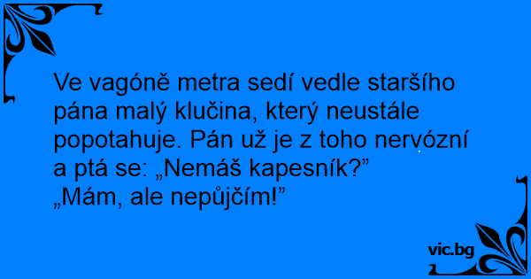 Ve vagóně metra sedí vedle staršího pána malý klučina, který neustále popotahuje. Pán už je z toho nervózní a ptá se: „Nemáš kapesník?”
