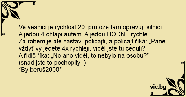 Za rohem je ale zastaví policajti, a policajt říká: „Pane, vždyť vy jedete 4x rychleji, viděl jste tu ceduli?”
