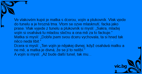 Кој го плесна гркот? Mit dem Zug durch den Tunnel gefährliche Zugfahrt Το τρένο Ο Γάλλος και ο Γερμανός Στο ίδιο βαγόνι Το φιλί Влак, в купето пътуват девойка с младата си майка и войник със старшина. Ein Deutscher, ein Österreicher, ein hübsches Mädchen und eine Nonne sitzen in einem Zugabteil. Седят си във влаково купе грък, македонец, млада жена с големи цици и австралийска баба. Пътуват в едно купе, майка с щерка и старшина с войник. Влакът влиза в тунел и се чува силно пляяяс. Излиза влака от тунела, а старшината се държи за бузата и си мисли: В купе на влак пътуват майка с дъщеря си и двама военни - единия старшина, другия редник. In einem Zugabteil sitzen ein Unternehmer und sein Arbeiter mit einer alten und einer hübschen, jungen Frau zusammen, als der Zug in einen Tunnel fährt. A young Programmer and his Project Manager board a train headed through the mountains on its way to Wichita. They can find no place to sit except for two seats right across the aisle from a young woman and her grandmother. Van un madrileño,un valenciano, una guapa y una fea en un vagón de tren....de repente el tren pasa x un tunel a oscuras y se oye PUM!!!!!.... Поезд. Едут генерал, курсант и мать с дочерью. Заезжают в тоннель и слышен звук пощечины. Мысли матери: Under andra världskriget. En tysk officer, en söt ung kvinna, en gammal gumma och en rumän sitter alla i samma kupe i ett rumänskt tåg Allt blir mörkt när tåget kommer in i en tunnel. Man hör först en kyss, sedan en kraftig smäll. Ingen säger något, men när det blir ljust i kupén igen ser man... Sitzen ein Deutscher, ein Österreicher, eine Nonne und eine junge Frau in einem Zugabteil. Der Zug fährt schließlich durch einen Tunnel und es wird stockdunkel. Plötzlich hört man ein Klatschen und einen Schmerzenslaut. Es wird wieder hell. Alle... Viajaban en un Tren, una hermoza mujer, una vieja Fea, un Chileno y un Peruano. El tren paso por un tunel y derrepente en medio de la oscuridad se escucho un tremendo cachetadon, al finalizar el... There was an Scotsman, an Englishman and Claudia Schiffer sitting together in a carriage in a train going through Wales. Suddenly the train went through a tunnel and as it was an old style train,... Een Belg, een Marokkaan, een non en een bloedmooie meid met een kort rokje en een paar ferme tieten zitten in een treincoupe. Op een gegeven moment rijdt de trein een tunnel in, het licht werkt... En un vagón de tren viajan una gorda, una rubia guapísima, un alemán y un andaluz. De pronto el tren se mete en un túnel y se queda el vagón a oscuras. Entonces se oye un guantazo enorme: ¡ZASCA!... An Englishman, a Frenchman, a ravishing blonde and an old lady are sharing a compartment on a train as it winds its way through the Alps. Every now and then the train passes through a tunnel,... In einem Eisenbahn-Abteil sitzen eine umwerfende Blondine, eine Nonne, ein Holländer und ein Deutscher. Der Zug fährt in einen Tunnel und man hört den Knall einer Ohrfeige. Mit roter Wange sieht... En una cabina de tren viajaban un mexicano, un yanqui, una rubia espectacular y una gorda espantosa... Después de unos minutos de viaje, el tren pasa por un tunel, y se oye el sonido de una... Valgkamp På en togtur fra København til Jylland, sad Mogens Lykktoft, Anders Fogh Rasmussen, en smuk blondine og en grim, fed kvinde i samme kupe. Da de kørte gennem Storebæltstunnelen, hørtes... W pociągu w jednym przedziale jadą matka z 18-letnią córką, generał i szeregowiec. Pociąg wjechał do tunelu, nagle słychać plaśnięcie jakby uderzenie w policzek. Co myśli każdy z pasażerów gdy... *Dünya Savaşı arefesinde; bir Nazi subayı, bir yaşlı kadın, bir delikanlı ve bir de genç kız bir tren kompartımanında yolculuk etmektedirler. Tren bir yerde tünele girer. Karanlıkta, bir öpücük... In uno scompartimento ferroviario ci sono una bella ragazza, una rispettabile vecchia signora, un sergente ed un soldato semplice. Il treno entra in una galleria buia e, per il solito... Un beau jour, dans un train, Chirac, Sarkozy et une belle norvégienne voyagent dans le même compartiment. Ils roulent ainsi, sans se parler, sans que rien ne se passe pendant des heures. Soudain,... Bir albay, bir er, bir yaşlı kadın ve bir de genç kız trende aynı kompartımanda yolculuk etmektedir. Tren bir tünele girip kompartıman Karardığı zaman, mucuk bir öpücük sesi ve ardından... Im D-Zug nach Zürich sitzen ein Schweizer Jüngling , ein großer Amerikaner , ein biederer alter Österreicher und eine Mutter mit ihrer 18jährigen Tochter zusammen in einem Abteil. Schließlich... Un jour dans un train, en Savoie, un Parisien (avec son écharpe du PSG), un Marseillais (avec son écharpe de l'OM) et une jolie Norvégienne sont dans le même compartiment. Ils roulent comme ça,... Estavam em um trem (na europa) 1 linda jovem francesa, 1 velha alemã, 1 brasileiro e 1 argentino. Os quatro viajavam no mesmo vagão quietos quando, ao passar por um túnel, tudo ficou as escuras. De... Sitting together on a train was Obama, George Bush Jr., a little old lady, and a young blonde girl with large breasts. The train goes into a dark tunnel and a few seconds later there is the sound... Estavam em um trem, uma velha, uma moça muito boa, um argentino e um brasileiro. O trem entrou num túnel muito escuro. Escutou-se um beijo e em seguida ossom de um tapa. A velha pensou: —... Een Nederlander, een non, een Duitser en een dom blondje zitten in de trein.