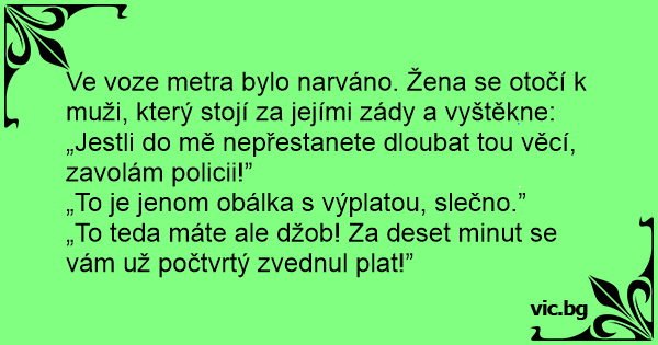 Ve voze metra bylo narváno. Žena se otočí k muži, který stojí za jejími zády a vyštěkne: „Jestli do mě nepřestanete dloubat tou věcí, zavolám policii!”