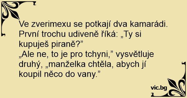 Ve zverimexu se potkají dva kamarádi. První trochu udiveně říká: „Ty si kupuješ piraně?”
