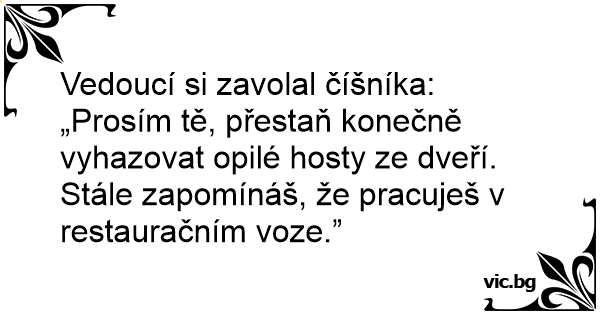 Vedoucí si zavolal číšníka: „Prosím tě, přestaň konečně vyhazovat opilé hosty ze dveří. Stále zapomínáš, že pracuješ v restauračním voze.”