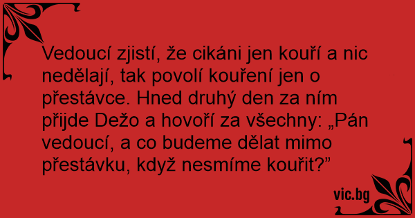 Vedoucí zjistí, že cikáni jen kouří a nic nedělají, tak povolí kouření jen o přestávce. Hned druhý den za ním přijde Dežo a hovoří za všechny: „Pán vedoucí, a co budeme dělat mimo přestávku, když nesmíme kouřit?”