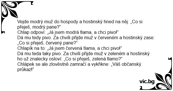 Vejde modrý muž do hospody a hostinský hned na něj: „Co si přeješ, modrý pane?”
