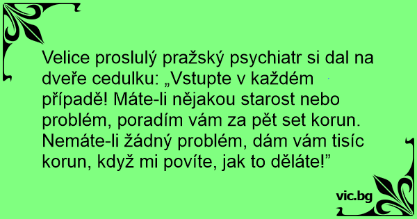 Velice proslulý pražský psychiatr si dal na dveře cedulku: „Vstupte v každém případě! Máte-li nějakou starost nebo problém, poradím vám za pět set korun. Nemáte-li žádný problém, dám vám tisíc korun, když mi povíte, jak to děláte!”