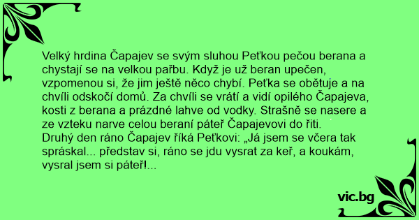Druhý den ráno Čapajev říká Peťkovi: „Já jsem se včera tak spráskal... představ si, ráno se jdu vysrat za keř, a koukám, vysral jsem si páteř! Nedovedeš si představit tu fušku, narvat ji zase zpátky!”