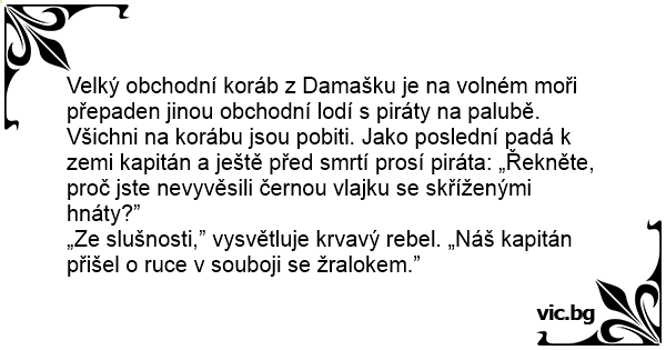Velký obchodní koráb z Damašku je na volném moři přepaden jinou obchodní lodí s piráty na palubě. Všichni na korábu jsou pobiti. Jako poslední padá k zemi kapitán a ještě před smrtí prosí piráta: „Řekněte, proč jste nevyvěsili černou vlajku se skříženými hnáty?”