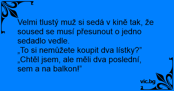 Velmi tlustý muž si sedá v kině tak, že sоusеd se musí přesunout o jedno sedadlo vedle.