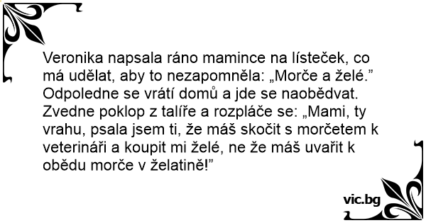Odpoledne se vrátí domů a jde se naobědvat. Zvedne poklop z talíře a rozpláče se: „Mami, ty vrahu, psala jsem ti, že máš skočit s morčetem k veterináři a koupit mi želé, ne že máš uvařit k obědu morče v želatině!”