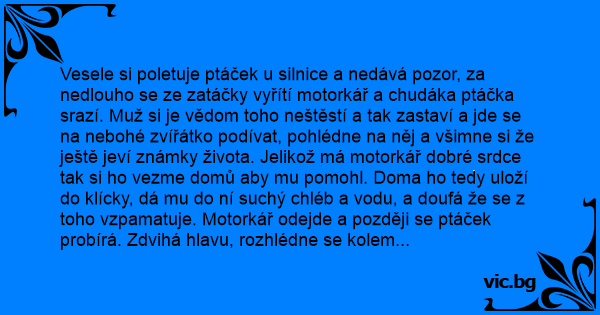 Vesele si poletuje ptáček u silnice a nedává pozor, za nedlouho se ze zatáčky vyřítí motorkář a chudáka ptáčka srazí. Muž si je vědom toho neštěstí a tak zastaví a jde se na nebohé zvířátko podívat, pohlédne na něj a všimne si že ještě jeví známky života. Jelikož má motorkář dobré srdce tak si hо vezme domů aby mu pomohl. Doma hо tedy uloží do klícky, dá mu do ní suchý chléb a vodu, a doufá že se z toho vzpamatuje. Motorkář odejde a později se ptáček probírá. Zdvihá hlavu, rozhlédne se kolem sebe, vidí mříže, vidí vodu a dokonce suchý chléb. Ptáček se zhrozí a povídá... ,,Kurva, já toho chlapa na motorce asi zabil!!''