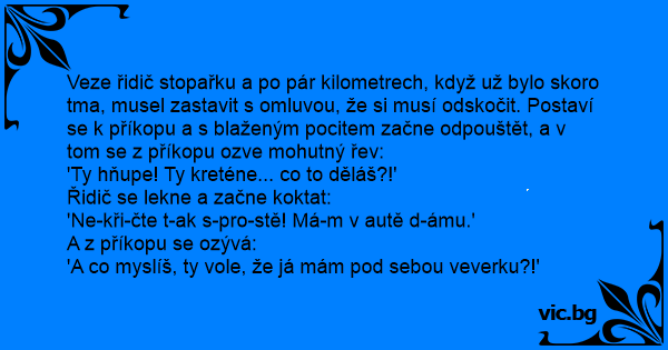Veze řidič stopařku a po pár kilometrech, když už bylo skoro tma, musel zastavit s omluvou, že si musí odskočit. Postaví se k příkopu a s blaženým pocitem začne odpouštět, a v tom se z příkopu ozve mohutný řev: