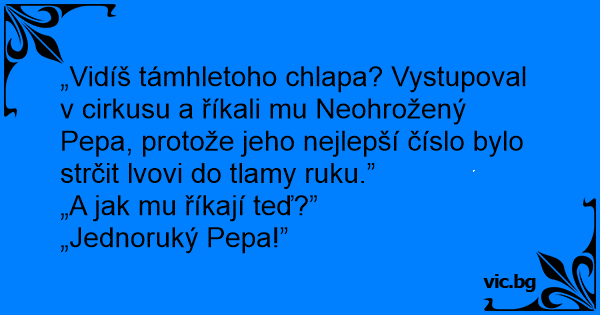 „Vidíš támhletoho chlapa? Vystupoval v cirkusu a říkali mu Neohrožený Pepa, protože jeho nejlepší číslo bylo strčit lvovi do tlamy ruku.”