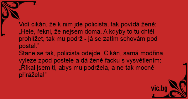 Vidí cikán, že k nim jde policista, tak povídá ženě: „Hele, řekni, že nejsem doma. A kdyby to tu chtěl prohlížet, tak mu podrž - já se zatím schovám pod postel.”