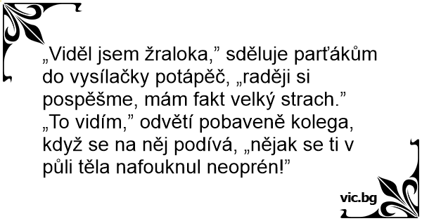 „To vidím,” odvětí pobaveně kolega, když se na něj podívá, „nějak se ti v půli těla nafouknul neoprén!”