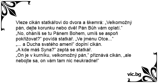 Vleze cikán statkářovi do dvora a škemrá: „Velkomožný pán, dejte korunku nebo dvě! Pán Bůh vám oplatí.”