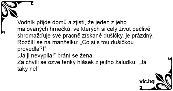 Vodník přijde domů a zjistí, že jeden z jeho malovaných hrnečků, ve kterých si celý život pečlivě shromažďuje své pracně získané dušičky, je prázdný. Rozčílí se na manželku: „Co si s tou dušičkou provedla?!”