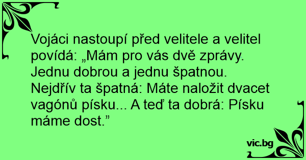 Vojáci nastoupí před velitele a velitel povídá: „Mám pro vás dvě zprávy. Jednu dobrou a jednu špatnou. Nejdřív ta špatná: Máte naložit dvacet vagónů písku... A teď ta dobrá: Písku máme dost.”