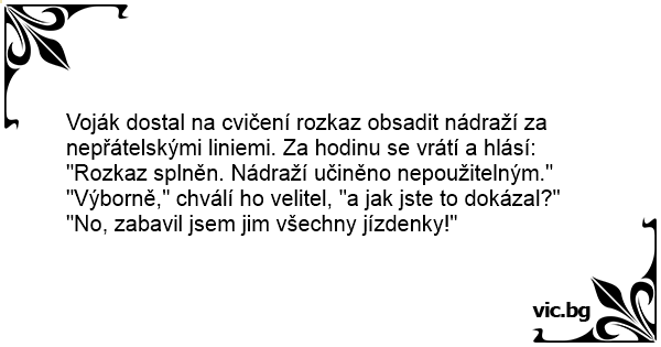 Voják dostal na cvičení rozkaz obsadit nádraží za nepřátelskými liniemi. Za hodinu se vrátí a hlásí: