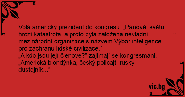Volá americký prezident do kongresu: „Pánové, světu hrozí katastrofa, a proto byla založena nevládní mezinárodní organizace s názvem Výbor inteligence pro záchranu lidské civilizace.”