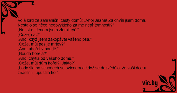 Volá lord ze zahraniční cesty domů: „Ahoj Jeane! Za chvíli jsem doma. Nestalo se něco neobvyklého za mé nepřítomnosti?”