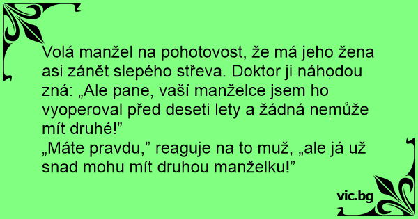 Volá manžel na pohotovost, že má jeho žena asi zánět slepého střeva. Doktor ji náhodou zná: „Ale pane, vaší manželce jsem hо vyoperoval před deseti lety a žádná nemůže mít druhé!”