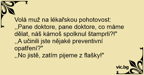 Volá muž na lékařskou pohotovost: ,,Pane doktore, pane doktore, co máme dělat, náš kámoš spolknul štamprli?!"