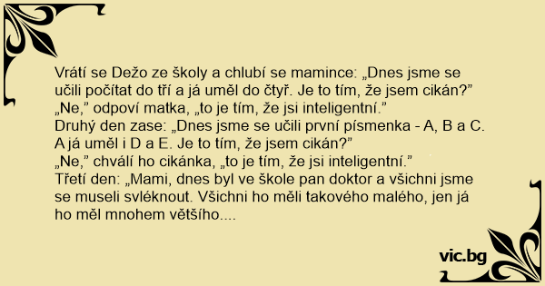 Vrátí se Dežo ze školy a chlubí se mamince: „Dnes jsme se učili počítat do tří a já uměl do čtyř. Je to tím, že jsem cikán?”