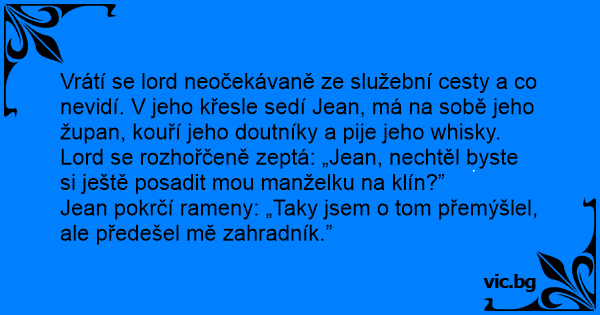 Vrátí se lord neočekávaně ze služební cesty a co nevidí. V jeho křesle sedí Jean, má na sobě jeho župan, kouří jeho doutníky a pije jeho whisky. Lord se rozhořčeně zeptá: „Jean, nechtěl byste si ještě posadit mou manželku na klín?”