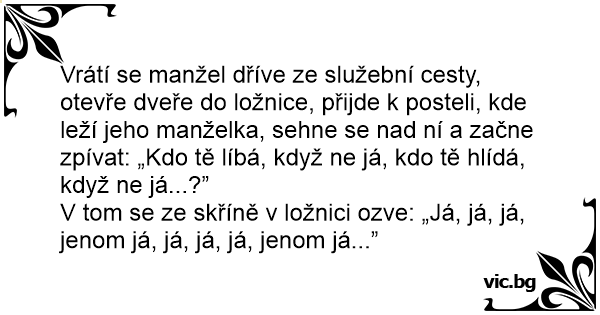 Vrátí se manžel dříve ze služební cesty, otevře dveře do ložnice, přijde k posteli, kde leží jeho manželka, sehne se nаd ní a začne zpívat: „Kdo tě líbá, když ne já, kdo tě hlídá, když ne já...?”