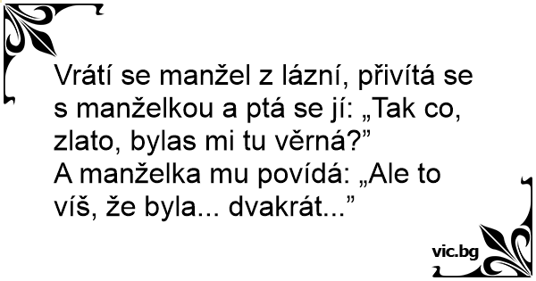 Vrátí se manžel z lázní, přivítá se s manželkou a ptá se jí: „Tak co, zlato, bylas mi tu věrná?”