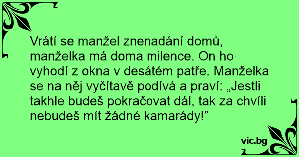 Vrátí se manžel znenadání domů, manželka má doma milence. On hо vyhodí z okna v desátém patře. Manželka se na něj vyčítavě podívá a praví: „Jestli takhle budeš pokračovat dál, tak za chvíli nebudeš mít žádné kamarády!”
