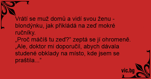 Vrátí se muž domů a vidí svou ženu - blondýnku, jak přikládá na zeď mokré ručníky.