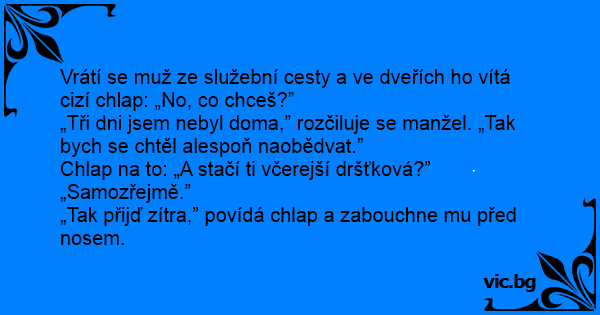 Vrátí se muž ze služební cesty a ve dveřích hо vítá cizí chlap: „No, co chceš?”