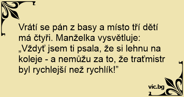 Vrátí se pán z basy a místo tří dětí má čtyři. Manželka vysvětluje: „Vždyť jsem ti psala, že si lehnu na koleje - a nemůžu za to, že traťmistr byl rychlejší než rychlík!”